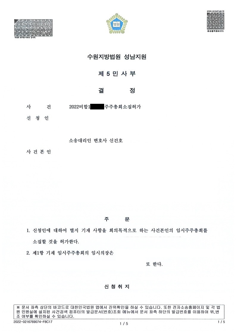 1. 주주총회소집허가 신청은 대상회사의 대표가 송달을 받지 않고 이를 회피하는 경우가 많습니다. 법원은 송달이 이루어지지 않는 경우 소집허가를 내주지 않으므로 신속한 송달을 위한 준비가 필요합니다.